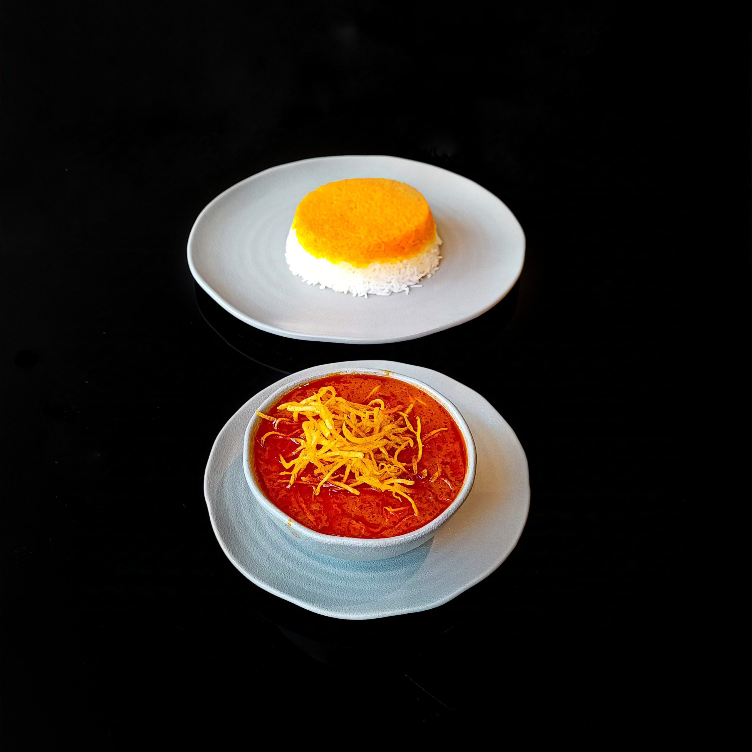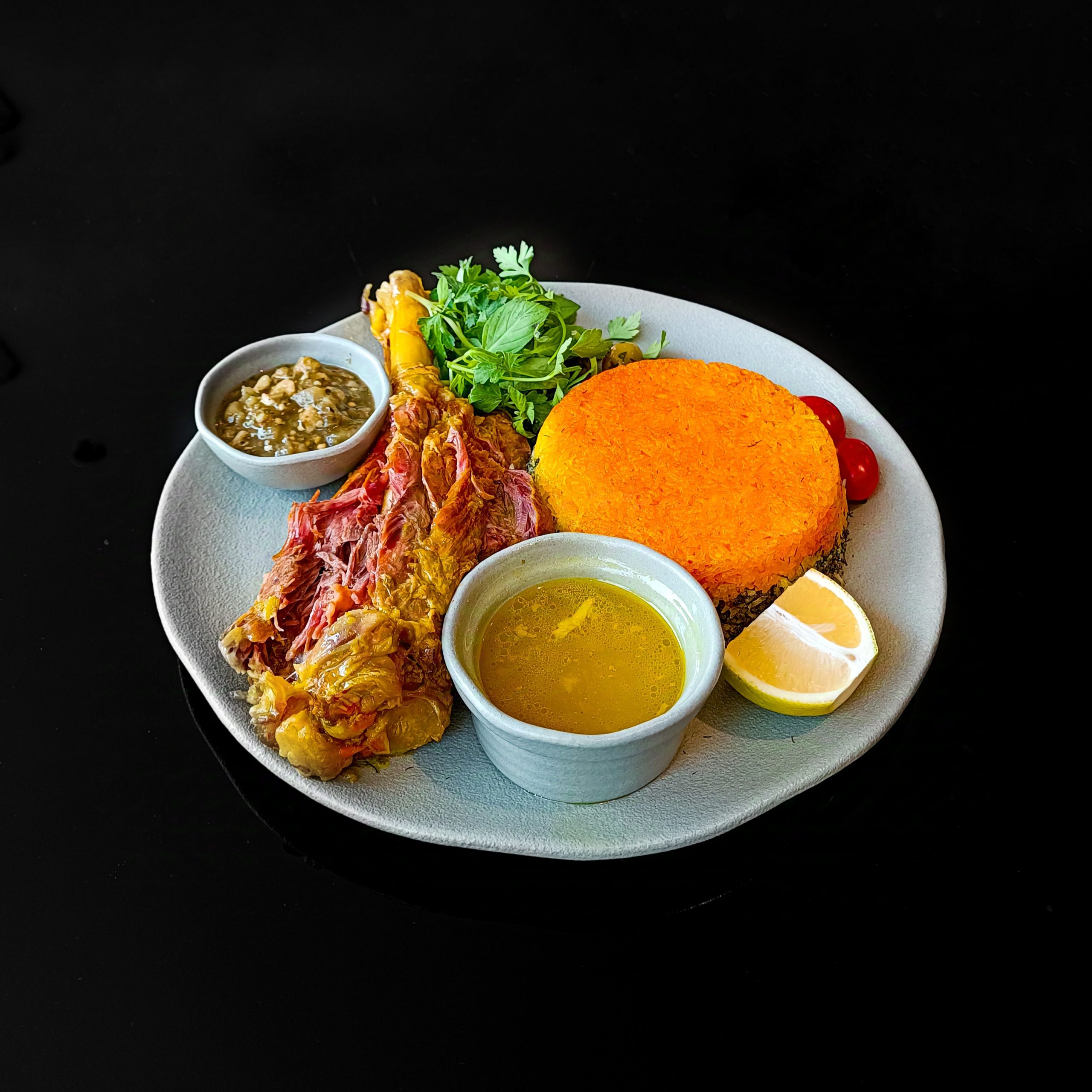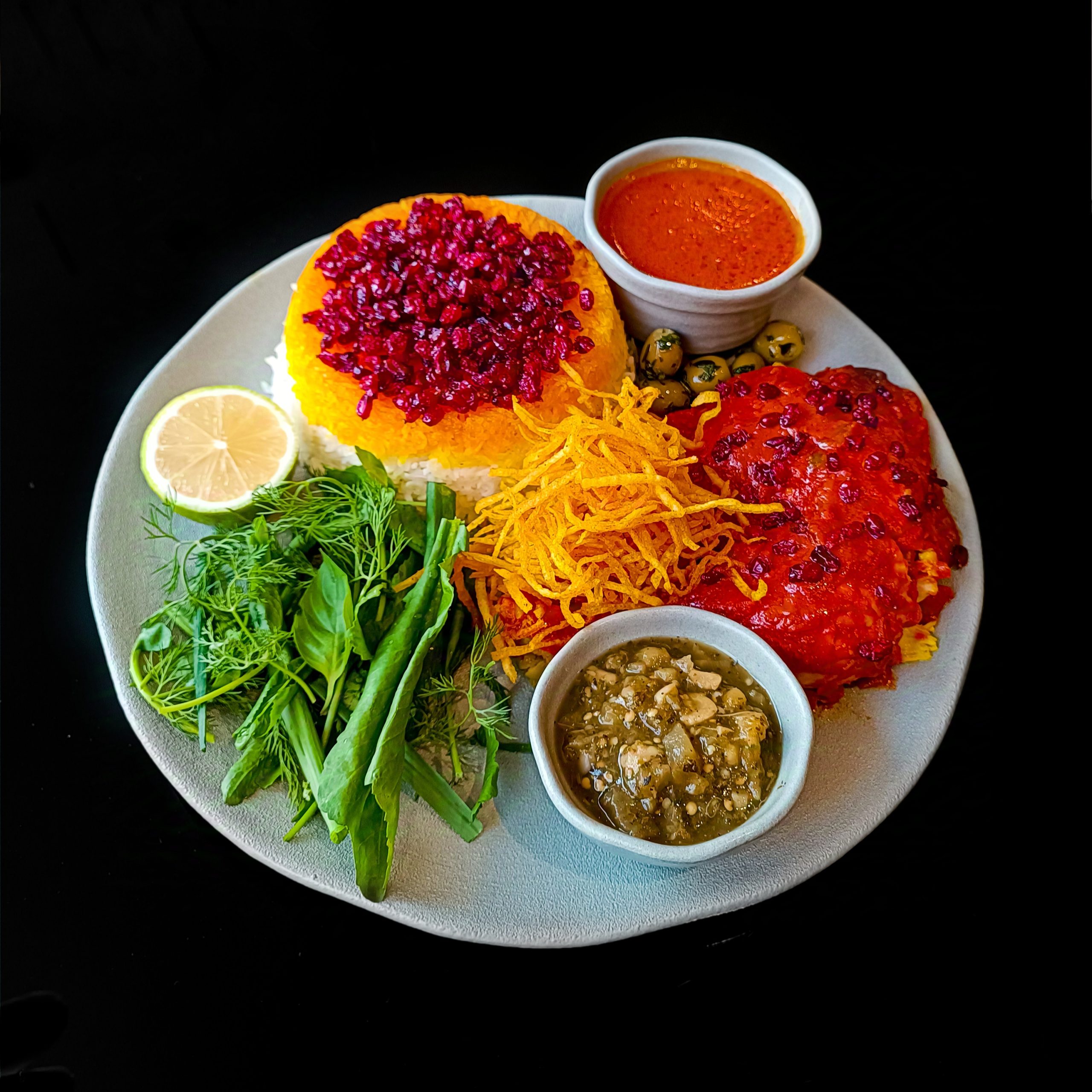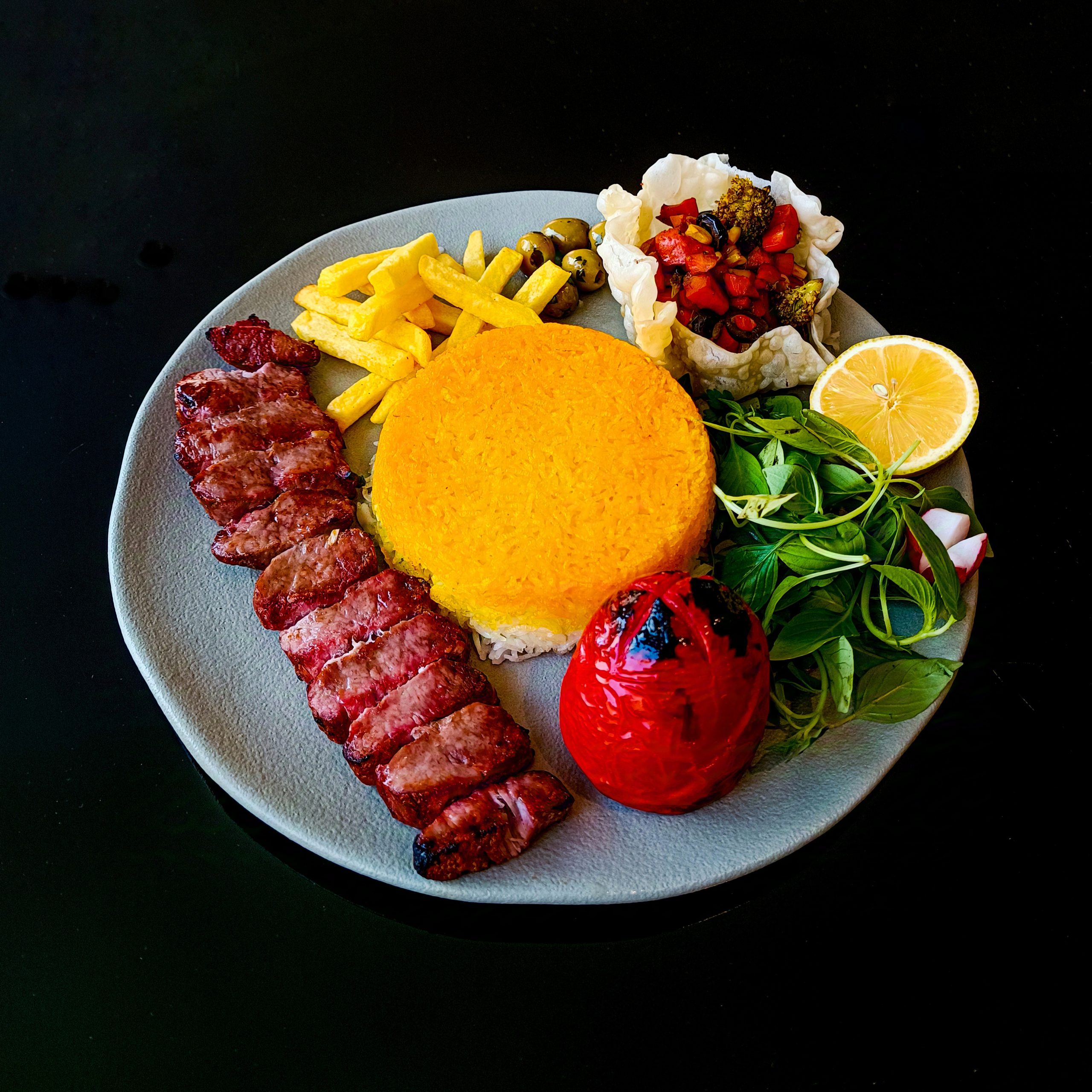 ته چین قالبی به همراه ماهیچه گوسفندی و ساید سبزیجات