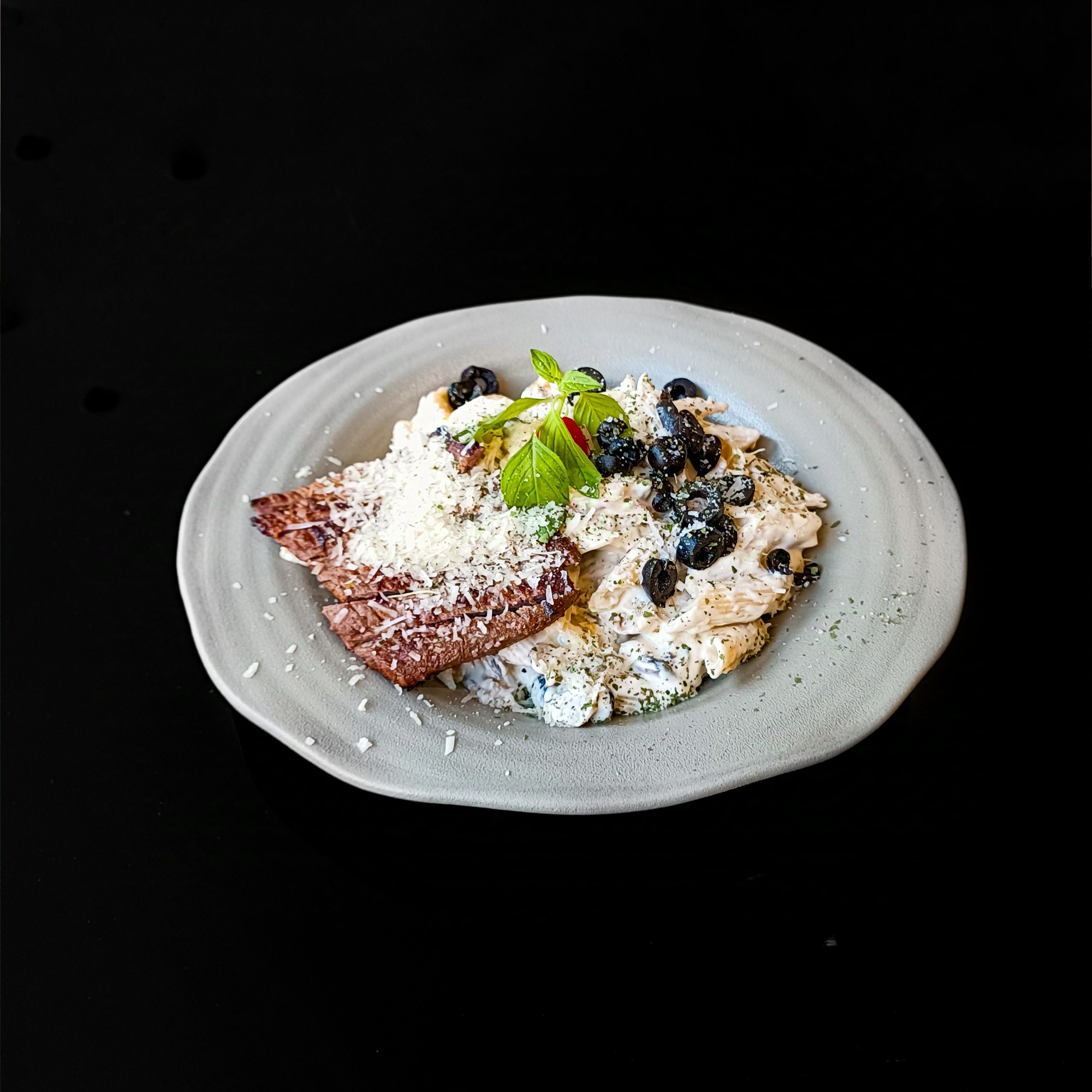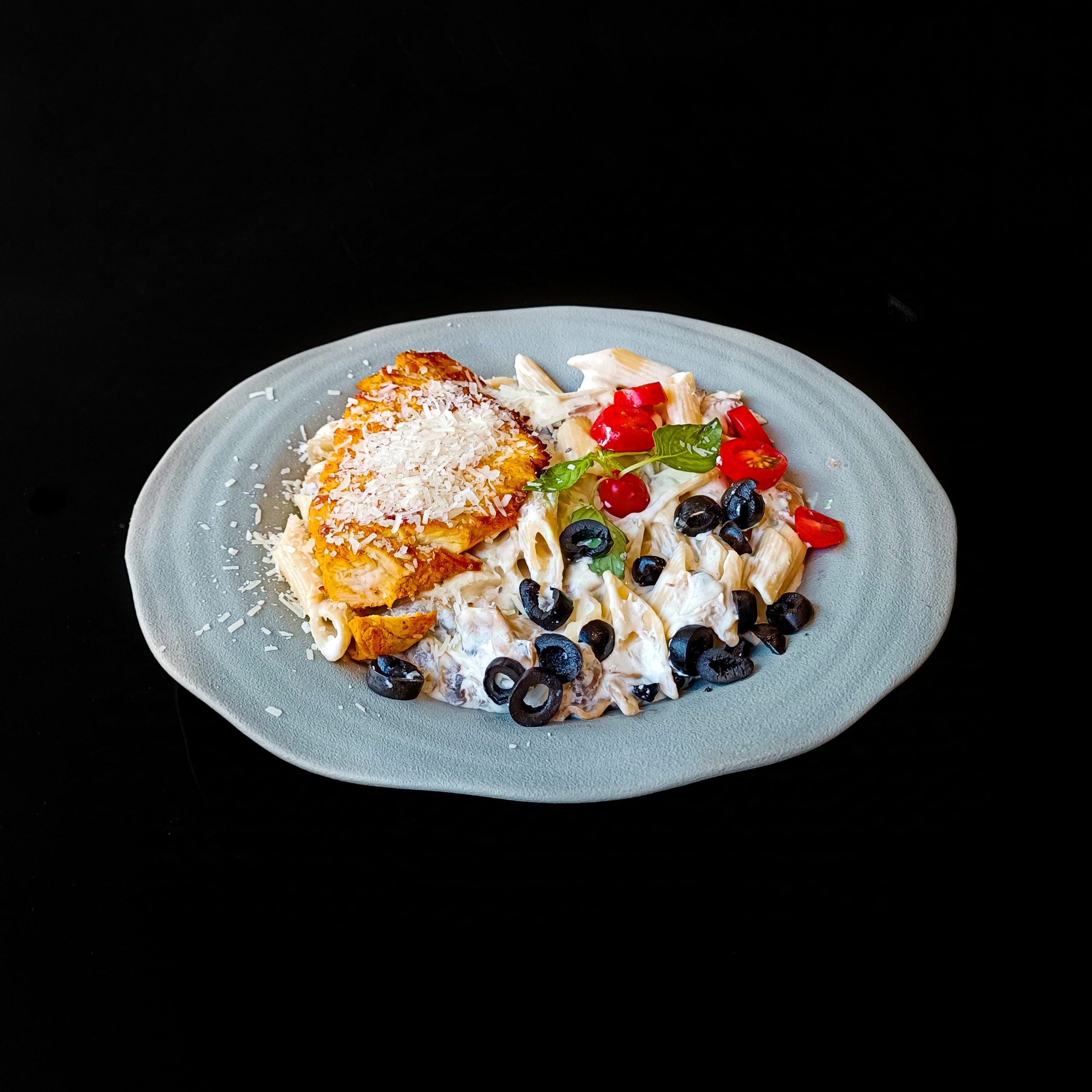 پنه به همراه مرغ گریل شده و سس قارچ و خامه