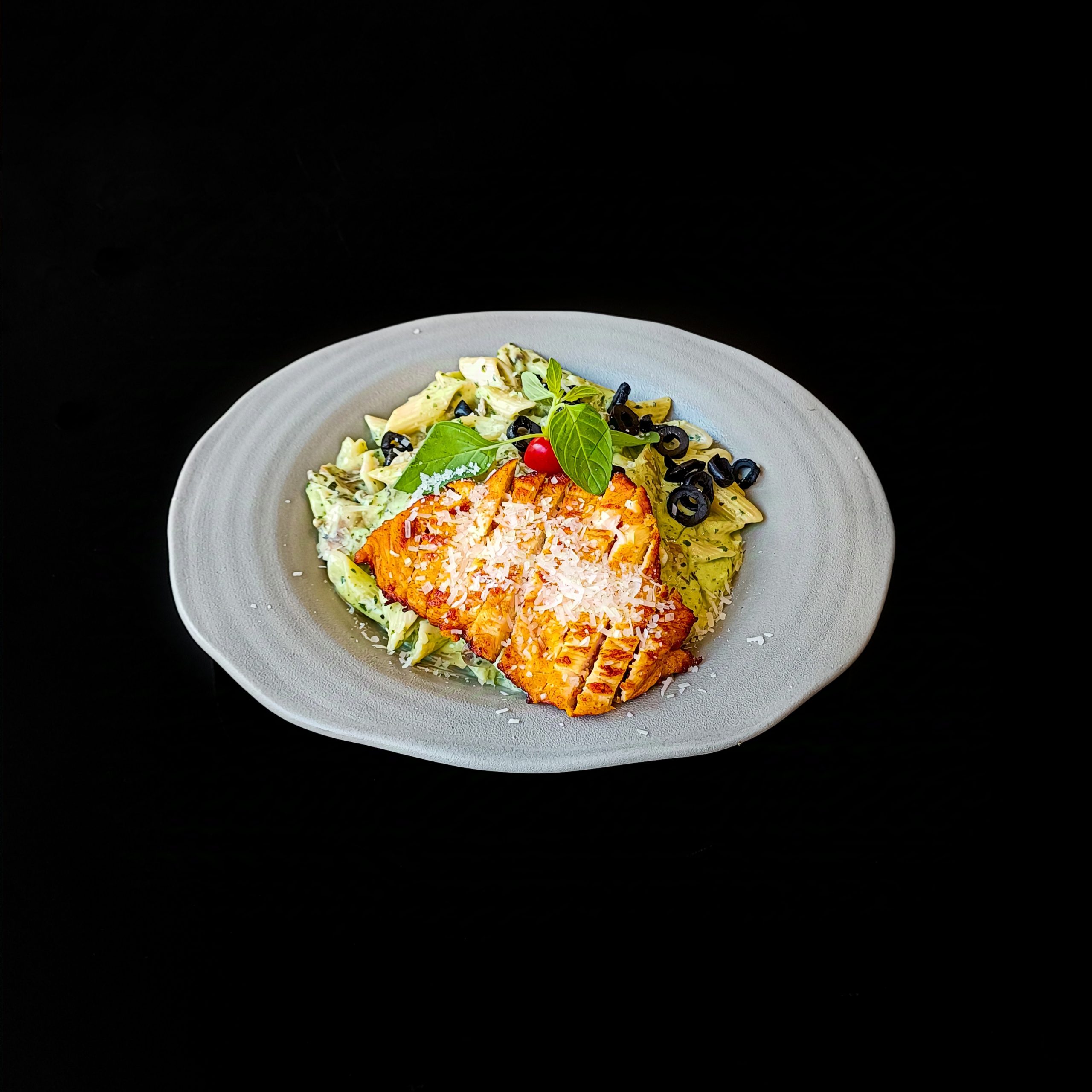 پنه به همراه مرغ گریل شده و سس پستو و قارچ