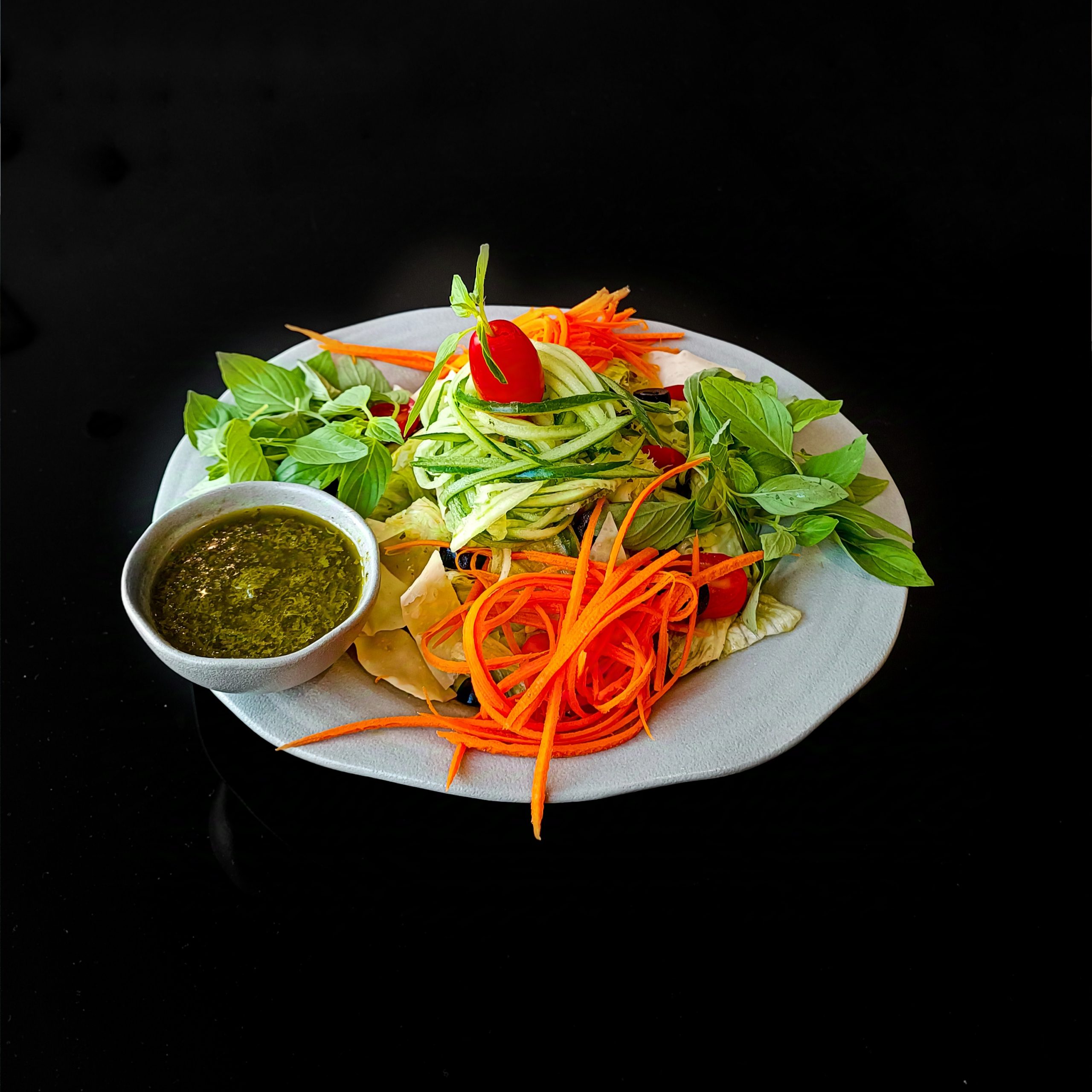 کاهو، گوجه گیلاسی، زیتون، تربچه، شاهی، ریحان، ذرت، خیار، بروکلی، نان مخصوص، سس ریحان