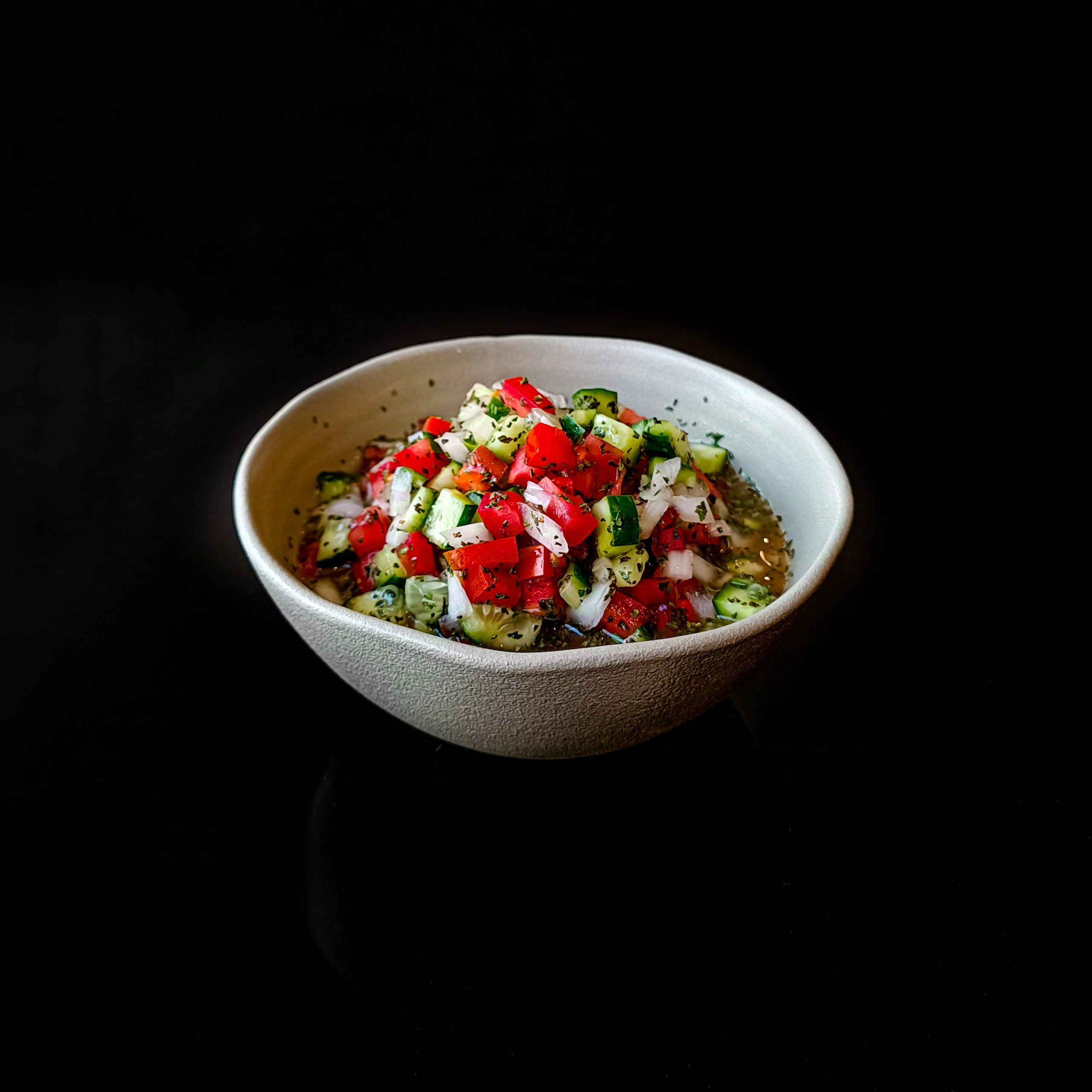 خیار، گوجه، پیاز، آبغوره، نعناع خشک، روغن زیتون