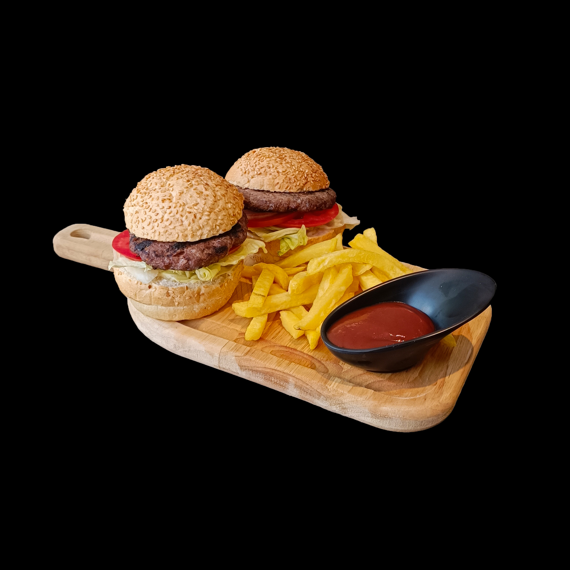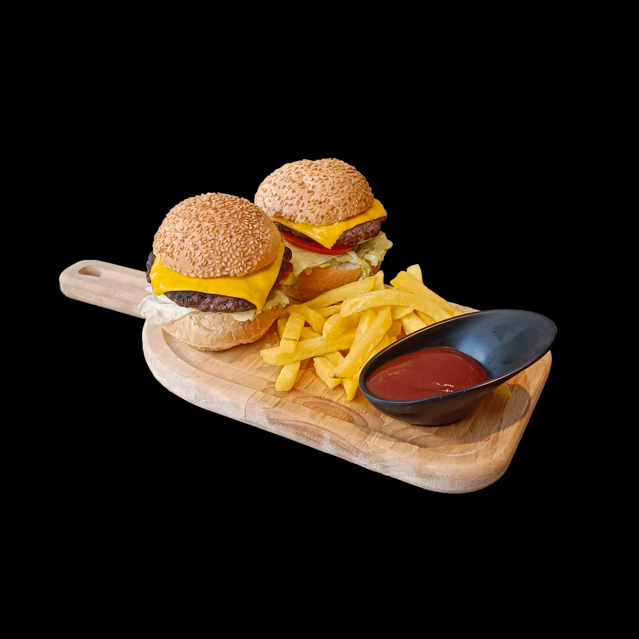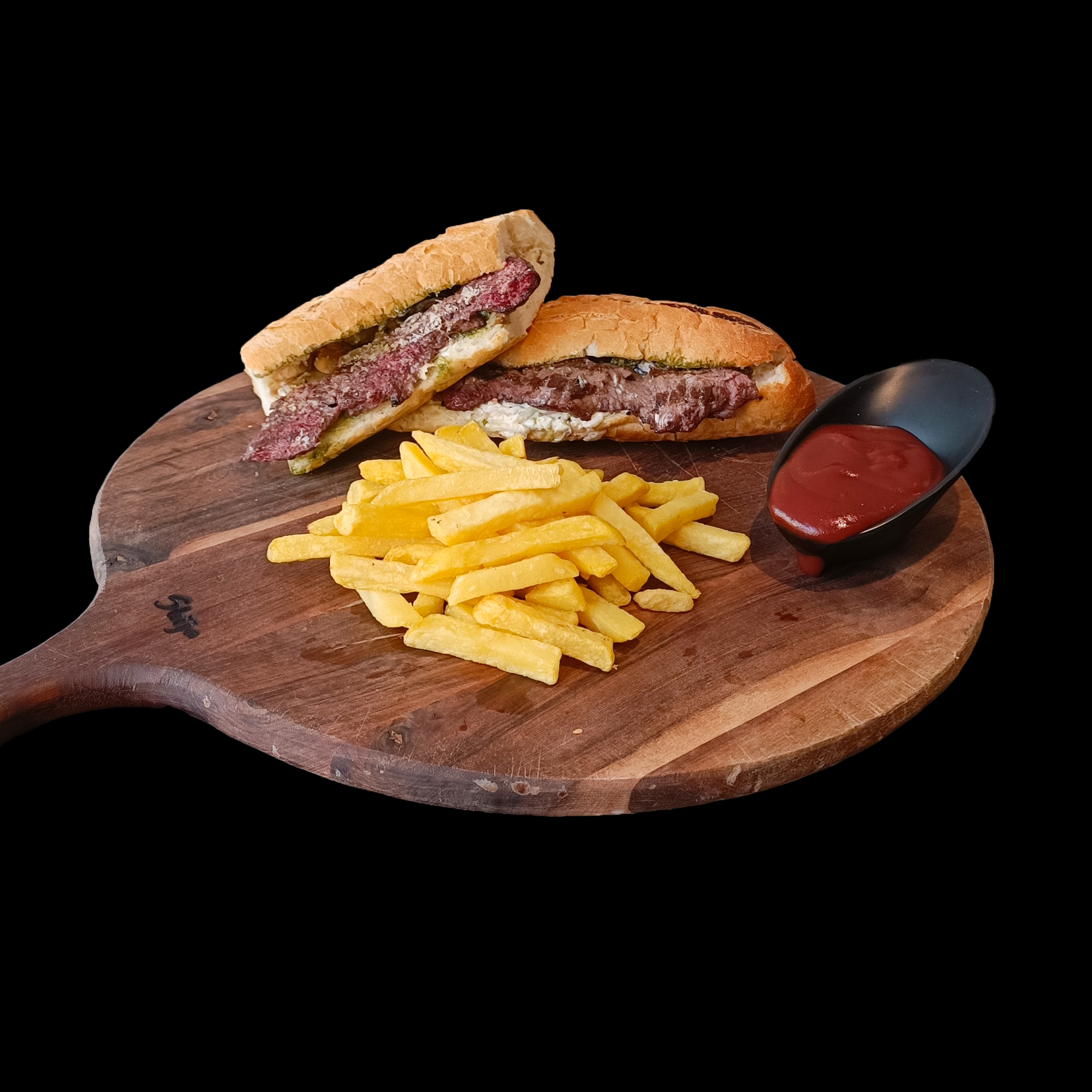 200 گرم گوشت چرخ شده، گوجه، کاهو، پیاز ورقهای، پنیر گودا، سس مخصوص به همراه سیب زمینی سرخ شده