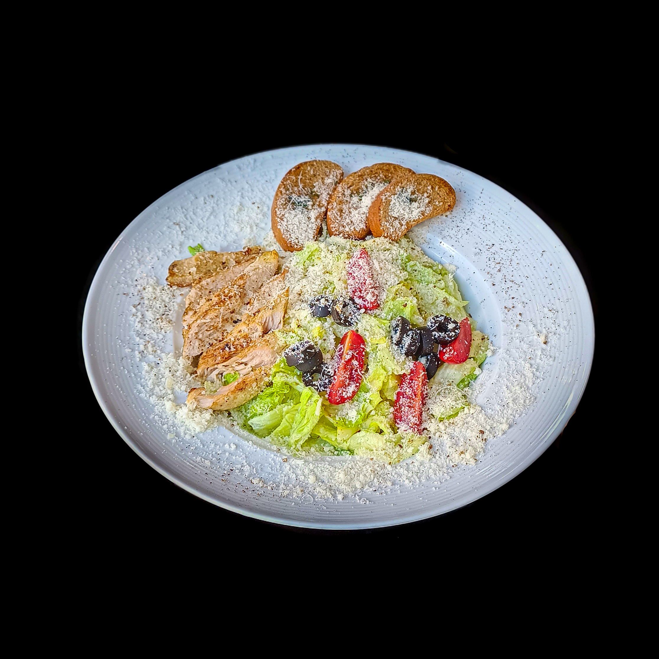 مرغ گریل شده، نان سیر، کاهو، گوجه گیلاسی، زیتون، پنیر پارمسان، سس مخصوص