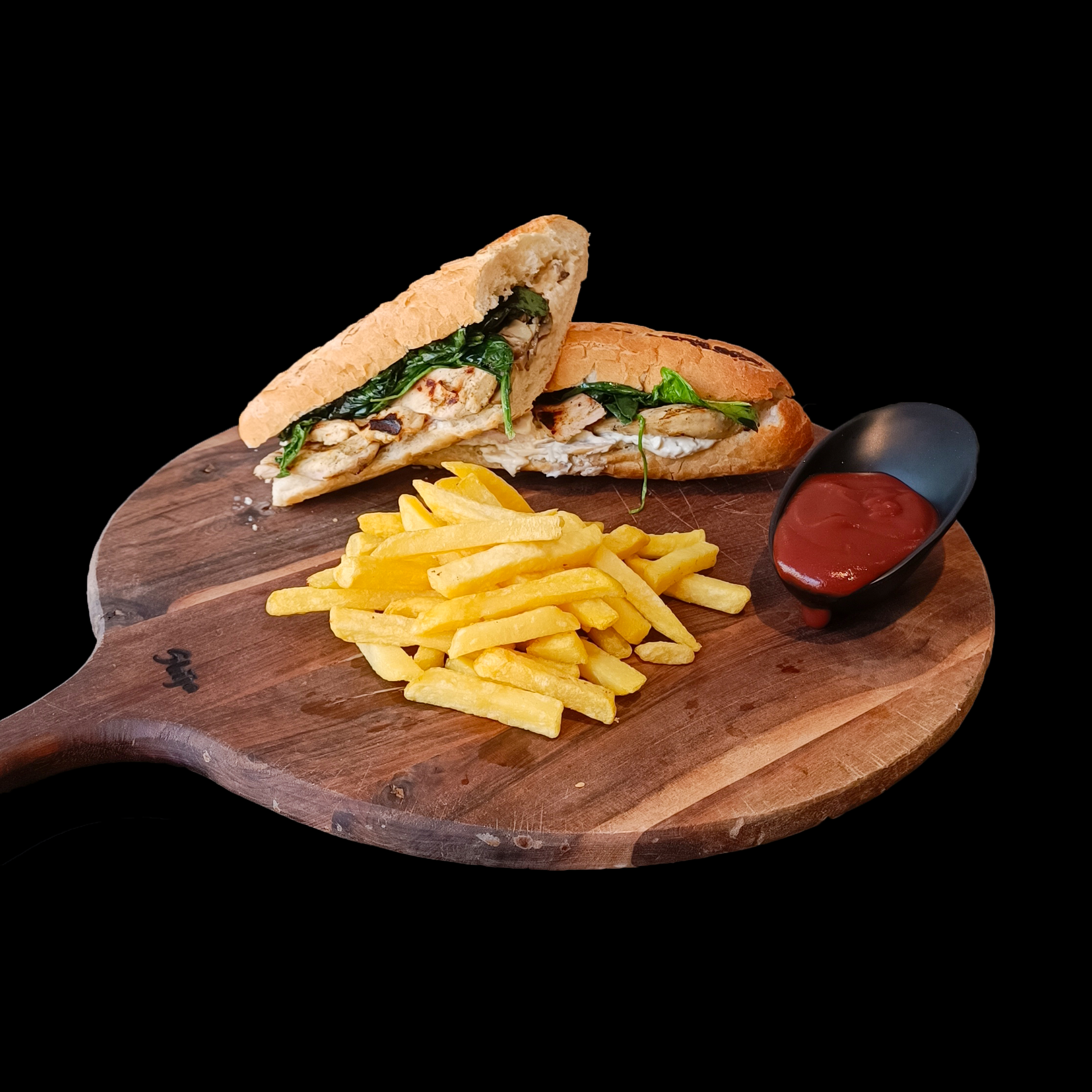 مرغ گریل شده، سس قارچ، اسفناج تازه و پنیر دانمارکی، نان چاپاتا، به همراه سیب زمینی سرخ شده