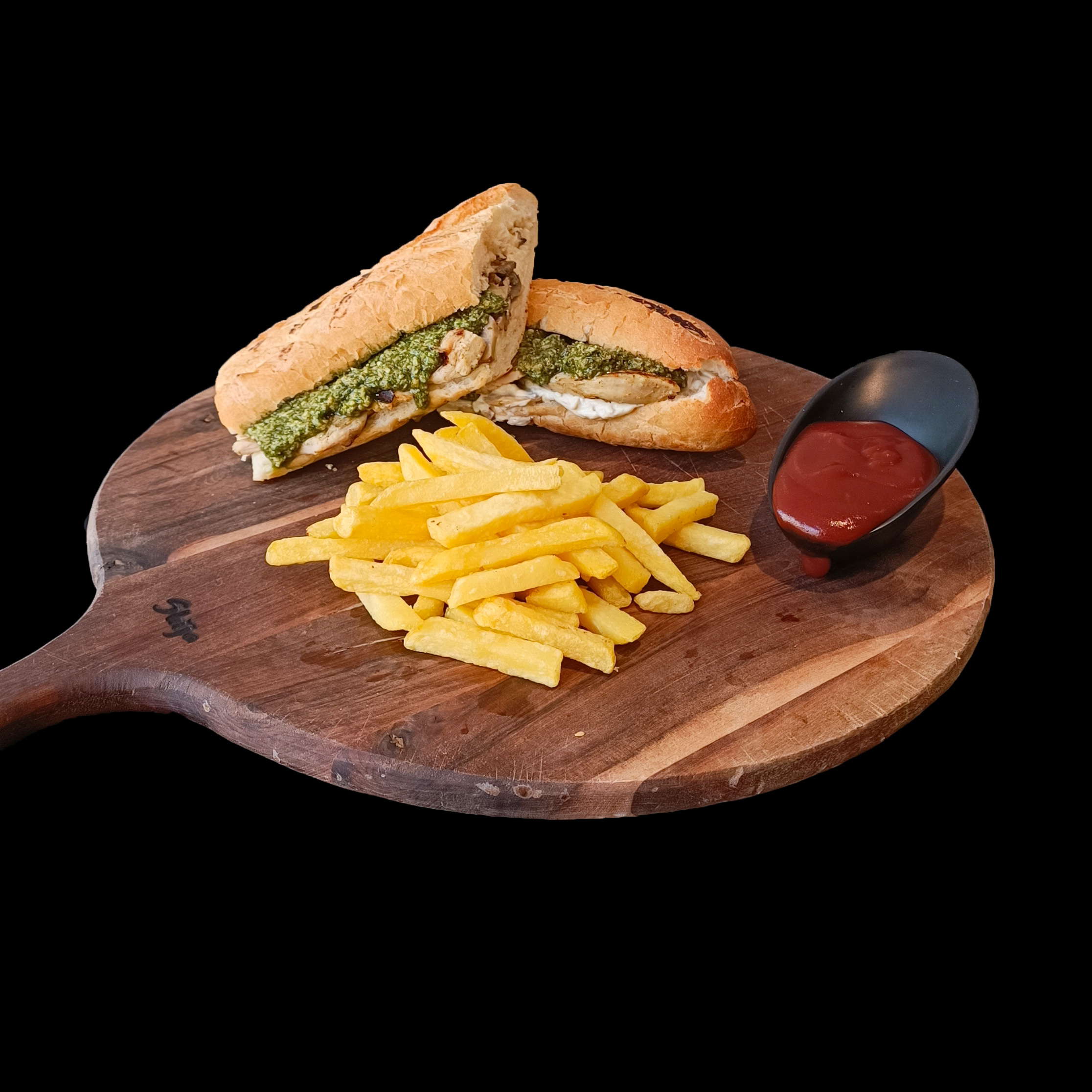 مرغ گریل شده، سس پستو، قارچ، پنیر دانمارکی، نان چاپاتا، به همراه سیب زمینی سرخ شده