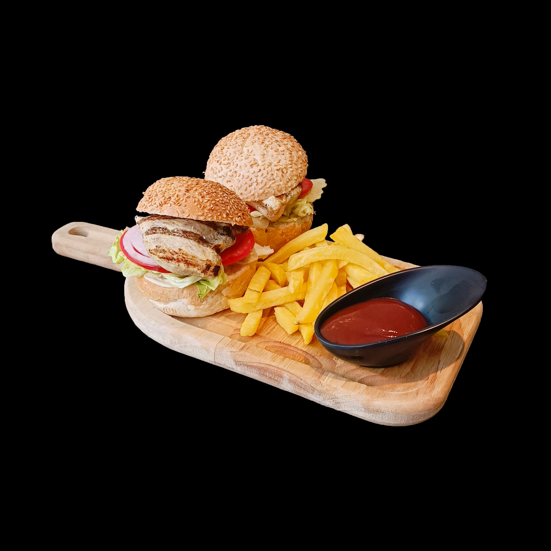 200 گرم مرغ گریل شده، گوجه، کاهو، پیاز ورقهای، سس مخصوص به همراه سیب زمینی سرخ شده